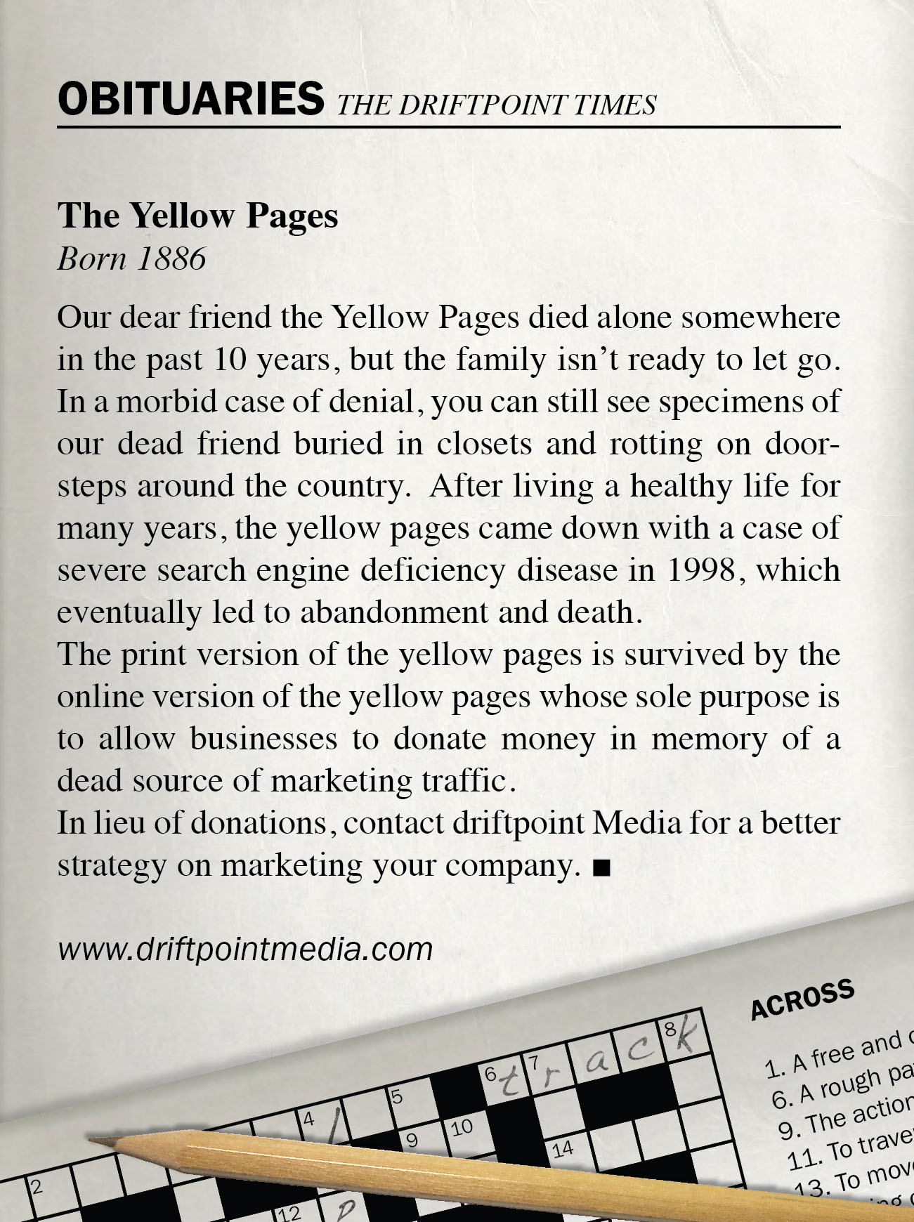 worth their weight in paper. If you feel like putting your name in there out of some level of obligation, go for the minimal listing. Driftpoint Media is not in the Yellow Pages. Our deadline to get in there this year is in 4 days from now.